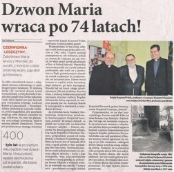 Dzisiaj rano, po 74 latach tułaczki, ufundowany przez Leszczynioków dzwon "Maria" z 1617 roku wrócił do rodzimej Parafii. Powitały go wszystkie aktualne dzwony oraz radosne i głośne "Te Deum laudamus" odśpiewane przez Parafian.